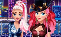Cyberpunk City Fashion is a dress-up game with futuristic neon cyberpunk fashion, with bright city lights at night in the background.